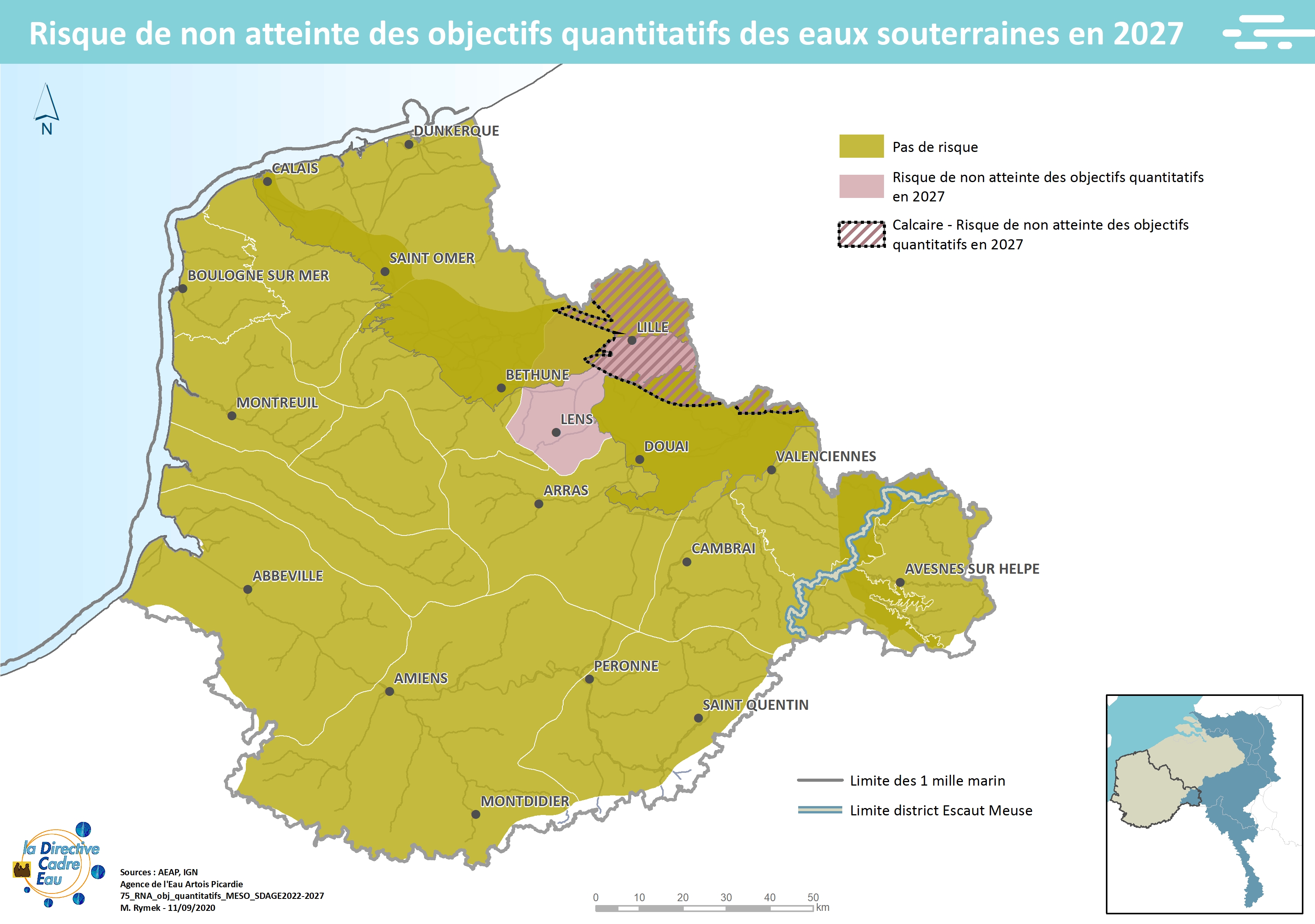 Cette carte issue du SDAGE 2022-2027 présente le risque de non atteinte des objectifs quantitatifs des eaux souterraines en 2027
