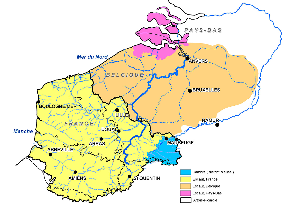 Cette carte représente le district Escaut dans le bassin Artois-Picardie, en Belgique et aux Pays Bas.