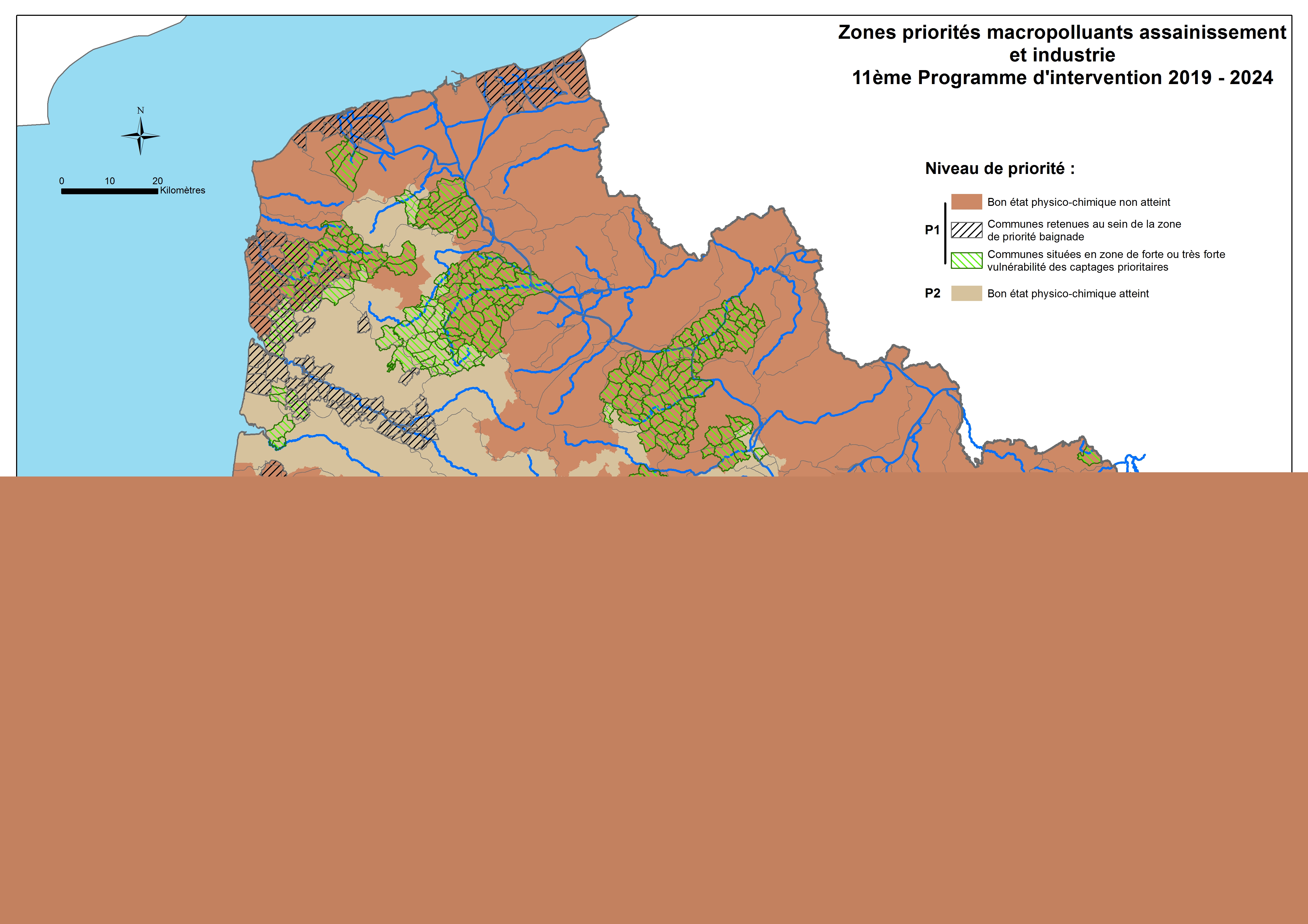 Différents zonages ont été définis pour orienter la mise en œuvre des politiques d’intervention de l’Agence au cours de la période 2019-2024. Cette carte représente les communes prioritaires et non prioritaires au titre de la lutte contre les macropolluants et la pollution microbiologique.