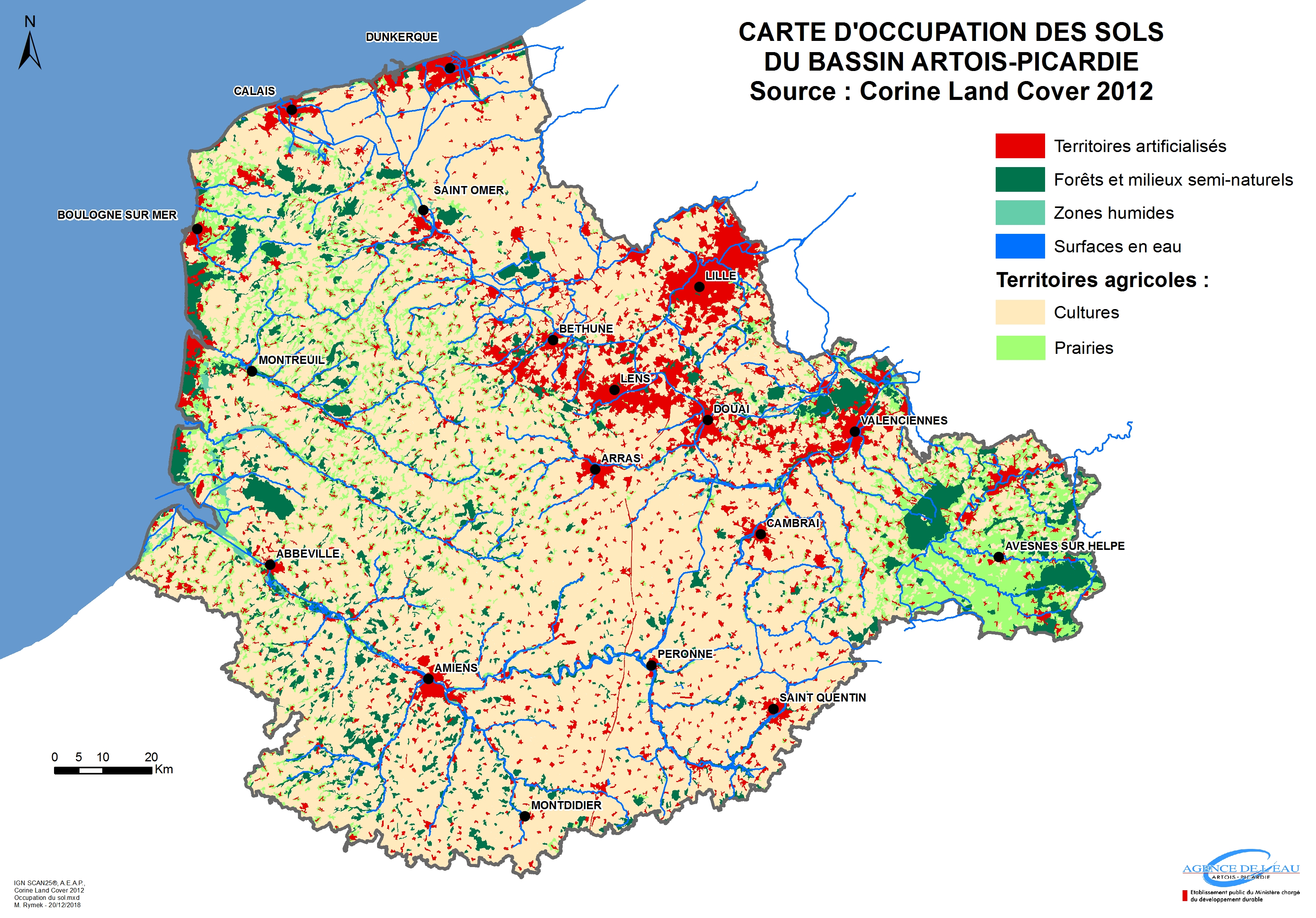 Carte d'occupation des sols du bassin Artois-Picardie. La base de données géographique CORINE Land Cover (CLC) est un inventaire biophysique de l'occupation des terres. Il est produit dans le cadre du programme européen d'observation de la terre Copernicus (39 États européens).