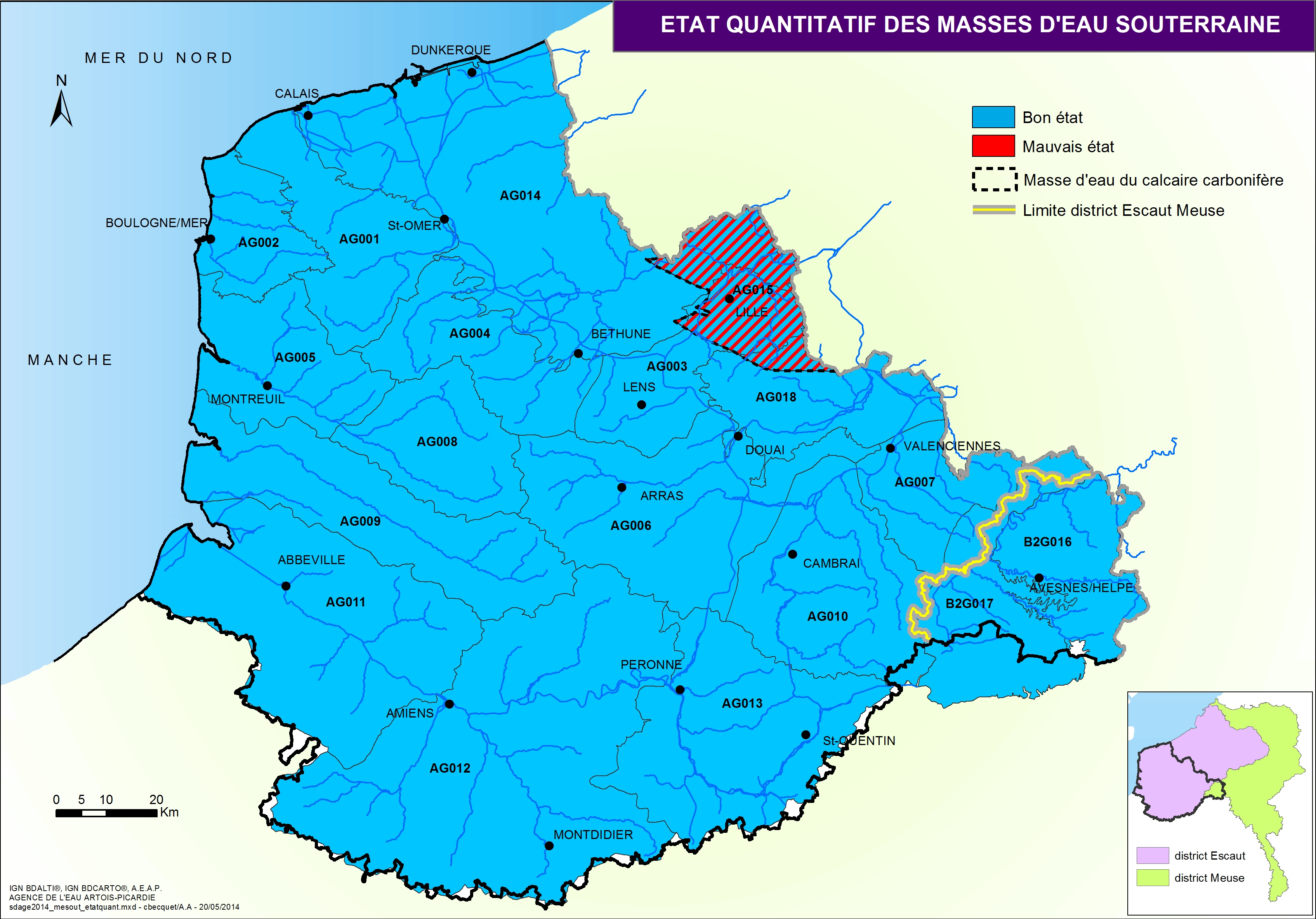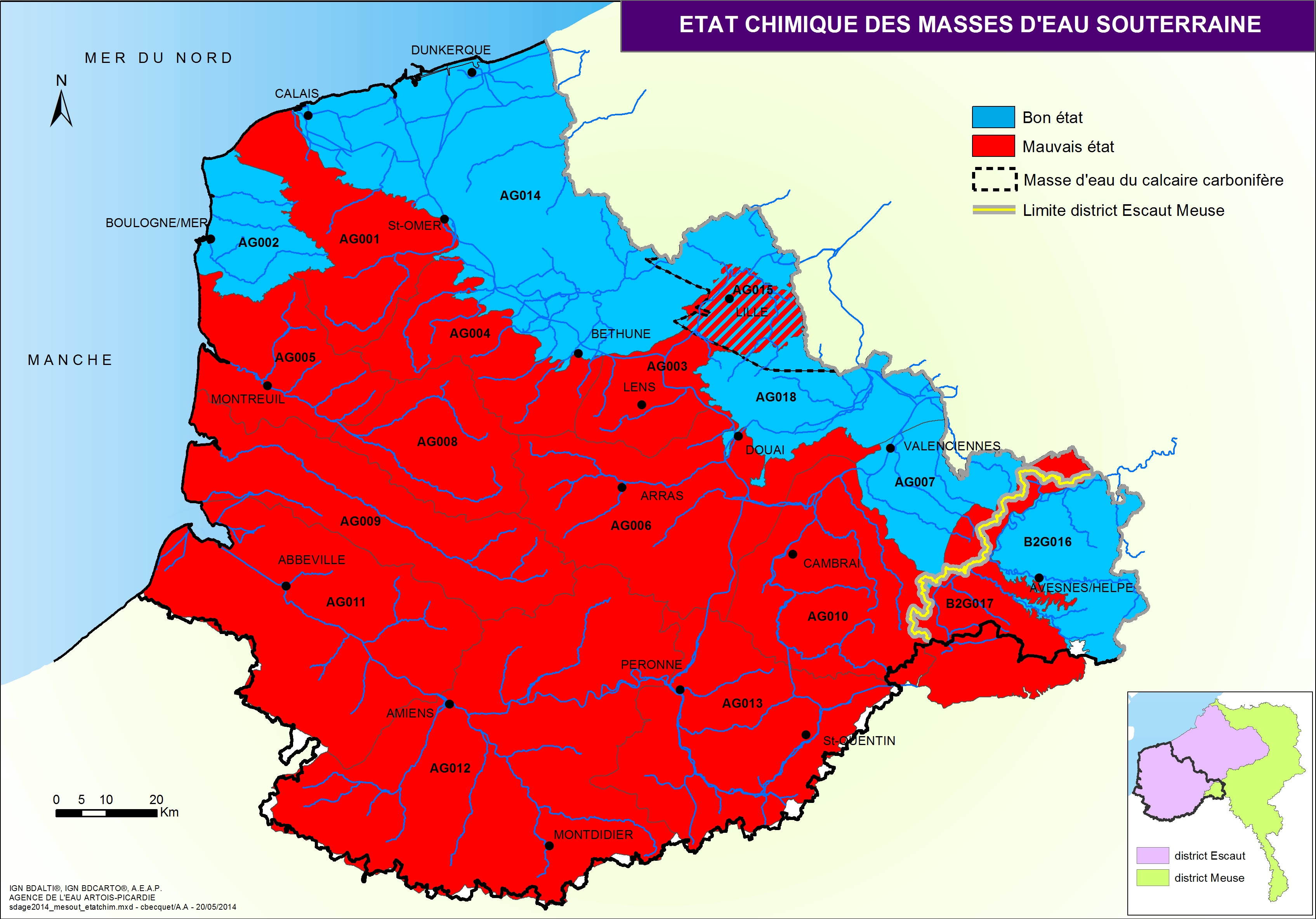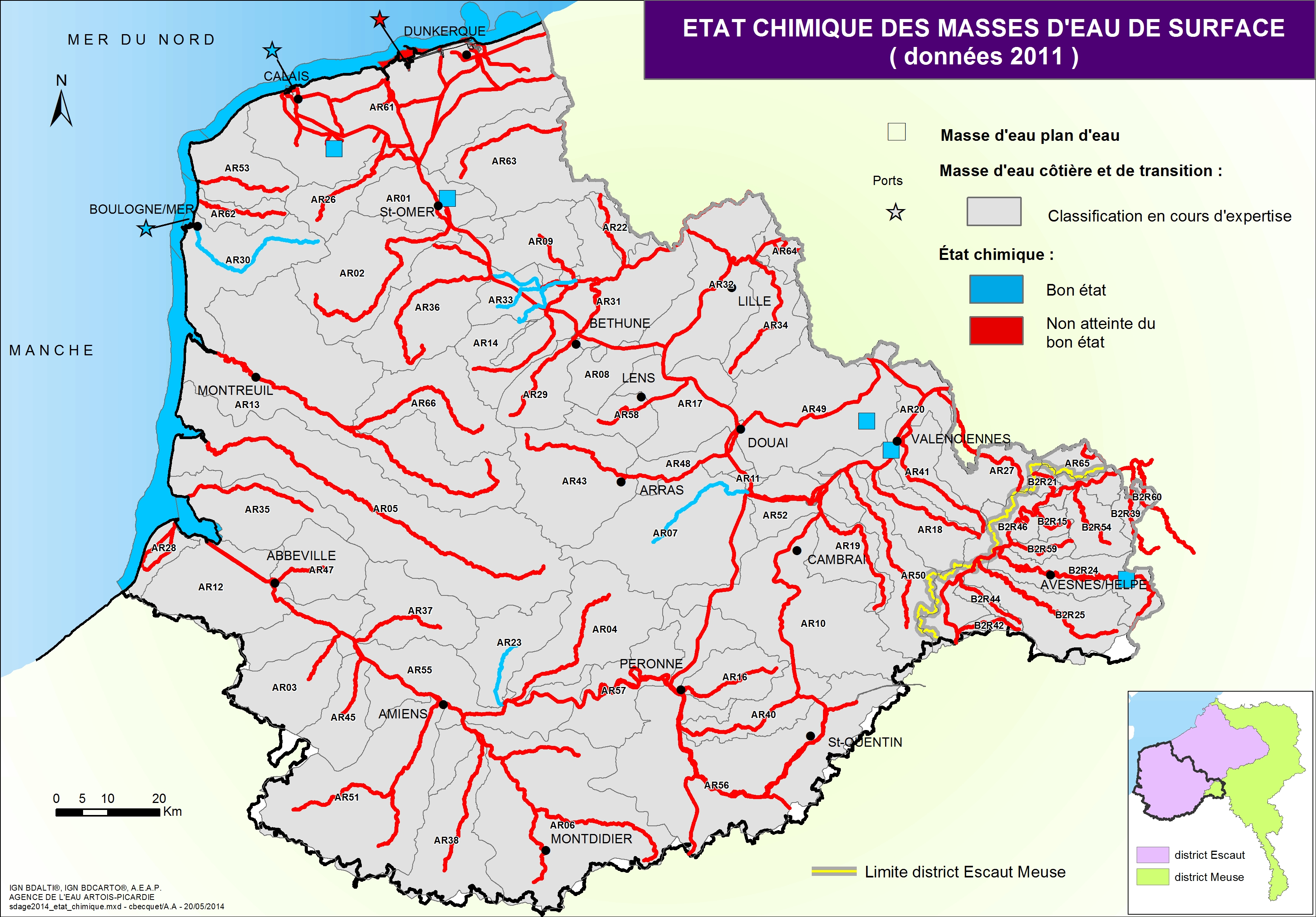 Le Schéma Directeur d'Aménagement et de Gestion des Eaux (SDAGE) fixe les objectifs d'atteinte du bon état des milieux aquatiques et les orientations pour atteindre ces objectifs. Cette carte issue du SDAGE 2016-2021 présente l'état chimique des masses d'eau de surface.