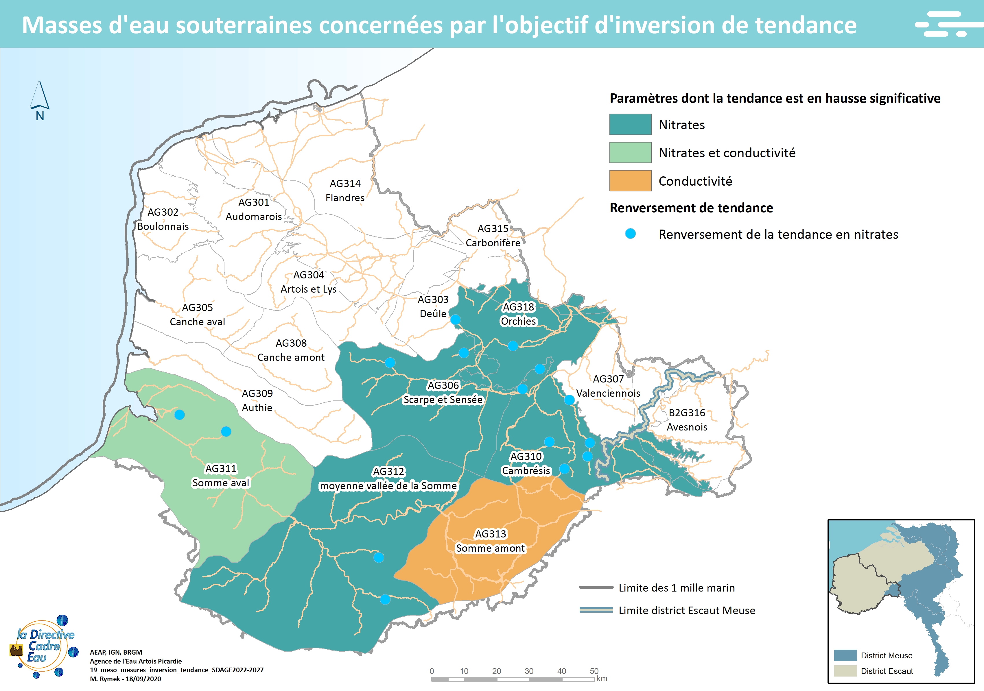 Cette carte issue du SDAGE 2022-2027 présente les masses d'eau souterraines concernées par l'objectif d'inversion de tendance