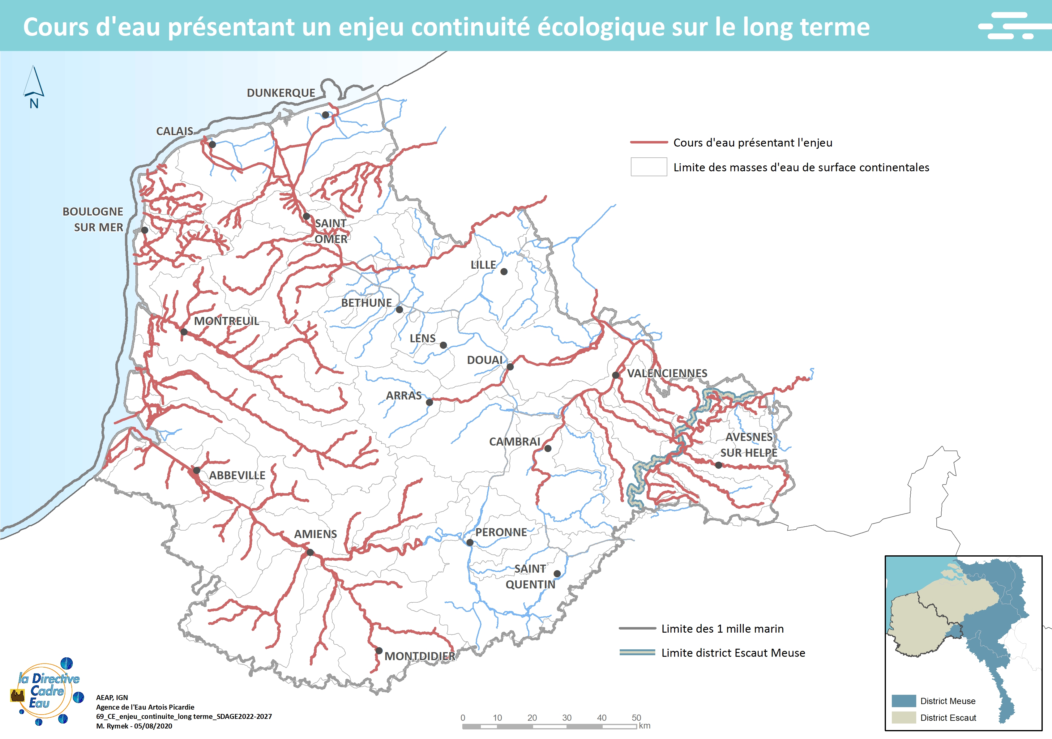 Cette carte issue du SDAGE 2022-2027 présente les cours d'eau présentant un enjeu continuité écologique à long terme